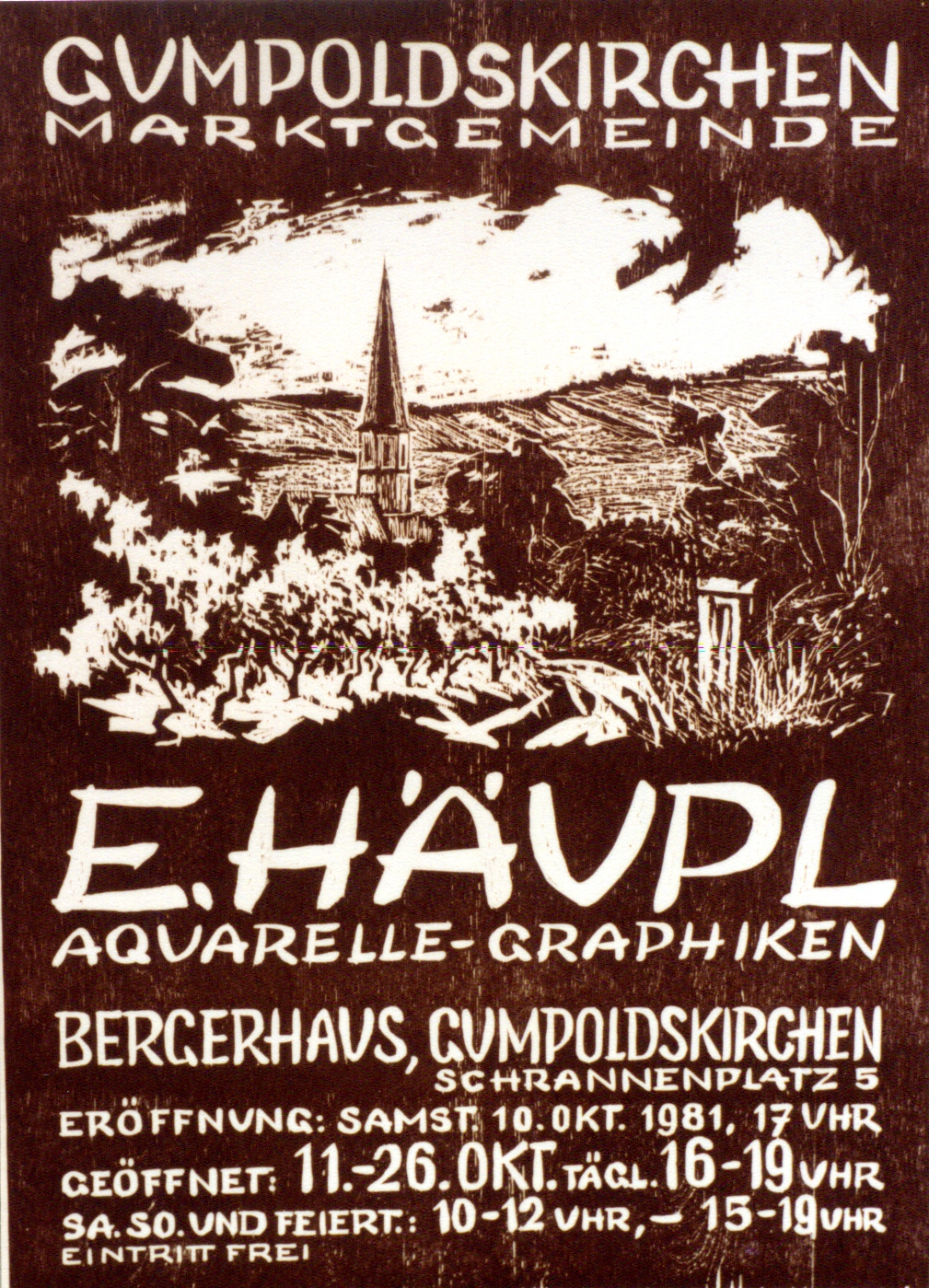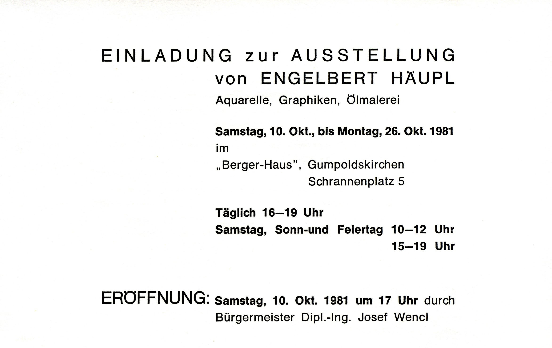 E. Häupl - AusstellungenEngelbert Häupl Ausstellung im „Bergerhaus“, Gumpoldskirchen Matthäus HäuplJuli 14, 2025Aug. 5, 2025 11. bis 26. 10. 1981 im Bergerhaus Gumpoldskirchen / NÖ Plakat / Einladung Plakat Einladung Einladung innen Pressemeldungen 14.10.1981 Mödlinger Zeitung 17.10.1981 Mödlinger Nachrichten Lebenslauf Grafische Arbeiten Plastische Arbeiten Sonstige Arbeiten Arbeiten in der Öffentlichkeit Ausstellungen Aus den Fotoalben Filme & Videos Presse-Archiv Liste Ergänzungen E. Häupl Den Künstlern auf der Spur We use cookies to improve your experience on our website Accept Decline