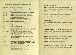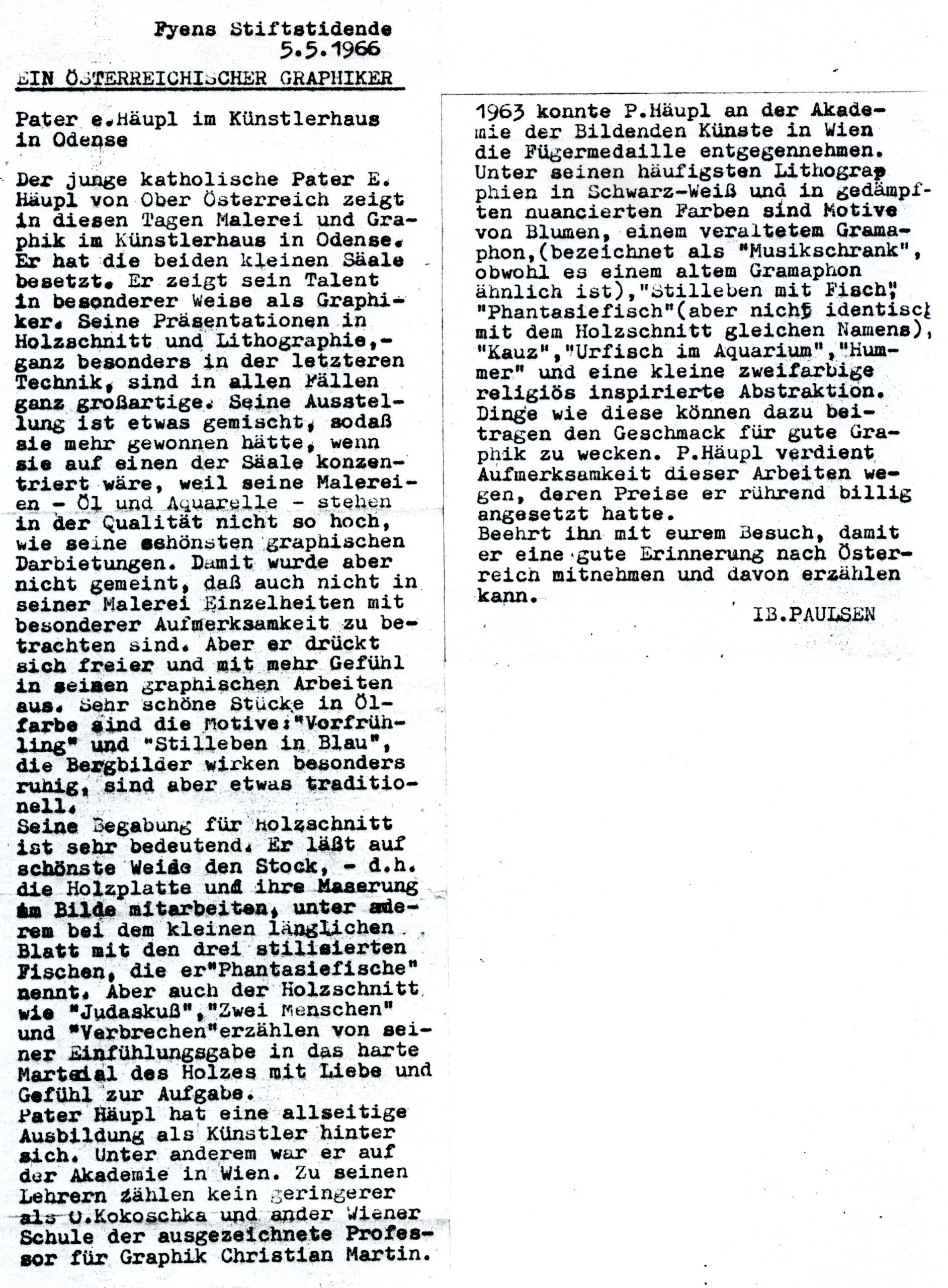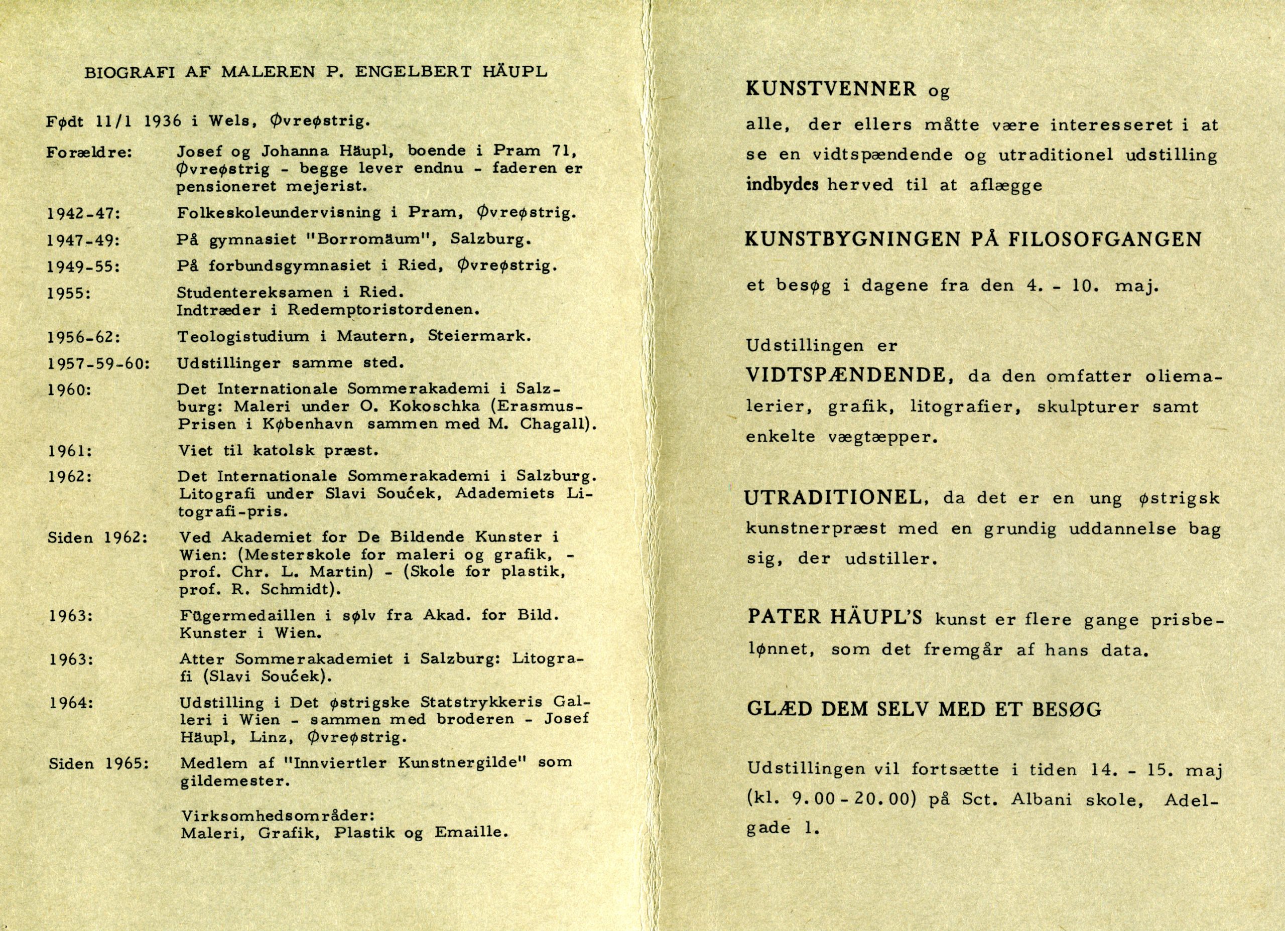 E. Häupl - AusstellungenEngelbert Häupl Ausstellung im Künstlerhaus in Odensee Matthäus HäuplJuli 14, 2025Aug. 13, 2025 04. bis 10. 05. 1966 in Filosofgangen Odensee / Dänemark Plakat / Einladung Plakat / Einladung Einladung Pressemeldungen 05.05.1966 Aktuelt 05.05.1966 Fyens Stiftstidende 05.05.1966 Fyens Tridente 08.05.1966 Aktuelt Presse diverse Schreiben Schreiben IB Paulsen Lebenslauf Grafische Arbeiten Plastische Arbeiten Sonstige Arbeiten Arbeiten in der Öffentlichkeit Ausstellungen Aus den Fotoalben Filme & Videos Presse-Archiv Liste Ergänzungen E. Häupl Den Künstlern auf der Spur We use cookies to improve your experience on our website Accept Decline