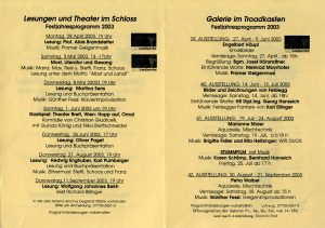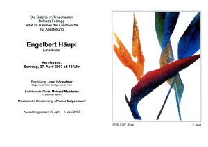 E. Häupl - AusstellungenEngelbert Häupl Ausstellung „Im Troadkasten“, Schloss Feldegg Matthäus HäuplJuli 16, 2025Aug. 5, 2025 27. 04. bis 01. 06. 2003 in der Galerie im Troadkasten Schloß Feldegg / OÖ Plakat / Einladung Einladung Jubiläumsfest Einladung Einladung innen Eintrittskarte Lebenslauf Grafische Arbeiten Plastische Arbeiten Sonstige Arbeiten Arbeiten in der Öffentlichkeit Ausstellungen Aus den Fotoalben Filme & Videos Presse-Archiv Liste Ergänzungen E. Häupl Den Künstlern auf der Spur We use cookies to improve your experience on our website Accept Decline