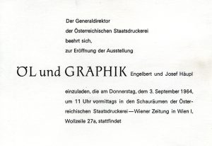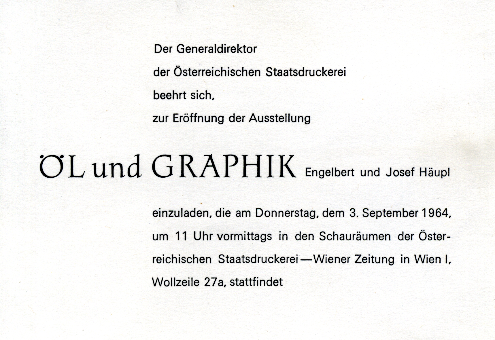 E. Häupl - AusstellungenEngelbert HäuplJ. Häupl – AusstellungenJosef Häupl Ausstellung in der Österr. Staatsdruckerei Matthäus HäuplJuli 14, 2025Aug. 15, 2025 03. 09. 1964 in den Schauräumen der Österr. Staatsdruckerei Wien Plakat / Einladung Einladung Eröffnung Pressemeldungen 04.09.1964 Wiener Zeitung 05.09.1964 Wiener Zeitung 07.09.1964 OÖ Nachrichten 16.09.1964 Volksstimme 18.09.1964 Volksblatt 19.09.1964 Die Furche 29.10.1964 Rieder VZ Lebenslauf Grafische Arbeiten Plastische Arbeiten Sonstige Arbeiten Arbeiten in der Öffentlichkeit Ausstellungen Aus den Fotoalben Filme & Videos Presse-Archiv Liste Ergänzungen E. Häupl Den Künstlern auf der Spur Biografie Grafische Arbeiten Ausstellungen Fotoarchiv Presse-Archiv Gästebuch Den Künstlern auf der Spur We use cookies to improve your experience on our website Accept Decline