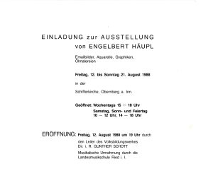 E. Häupl - AusstellungenEngelbert Häupl Ausstellung in der „Schifferkirche“, Obernberg a.l. Matthäus HäuplJuli 14, 2025Aug. 5, 2025 12. bis 21. 08. 1988 in der Schifferkirche Obernberg / OÖ Plakat / Einladung Einladung Einladung innen Video Pressemeldungen 11.08.1988 Rieder Volkszeitung 18.08.1988 Rieder Volkszeitung Lebenslauf Grafische Arbeiten Plastische Arbeiten Sonstige Arbeiten Arbeiten in der Öffentlichkeit Ausstellungen Aus den Fotoalben Filme & Videos Presse-Archiv Liste Ergänzungen E. Häupl Den Künstlern auf der Spur We use cookies to improve your experience on our website Accept Decline