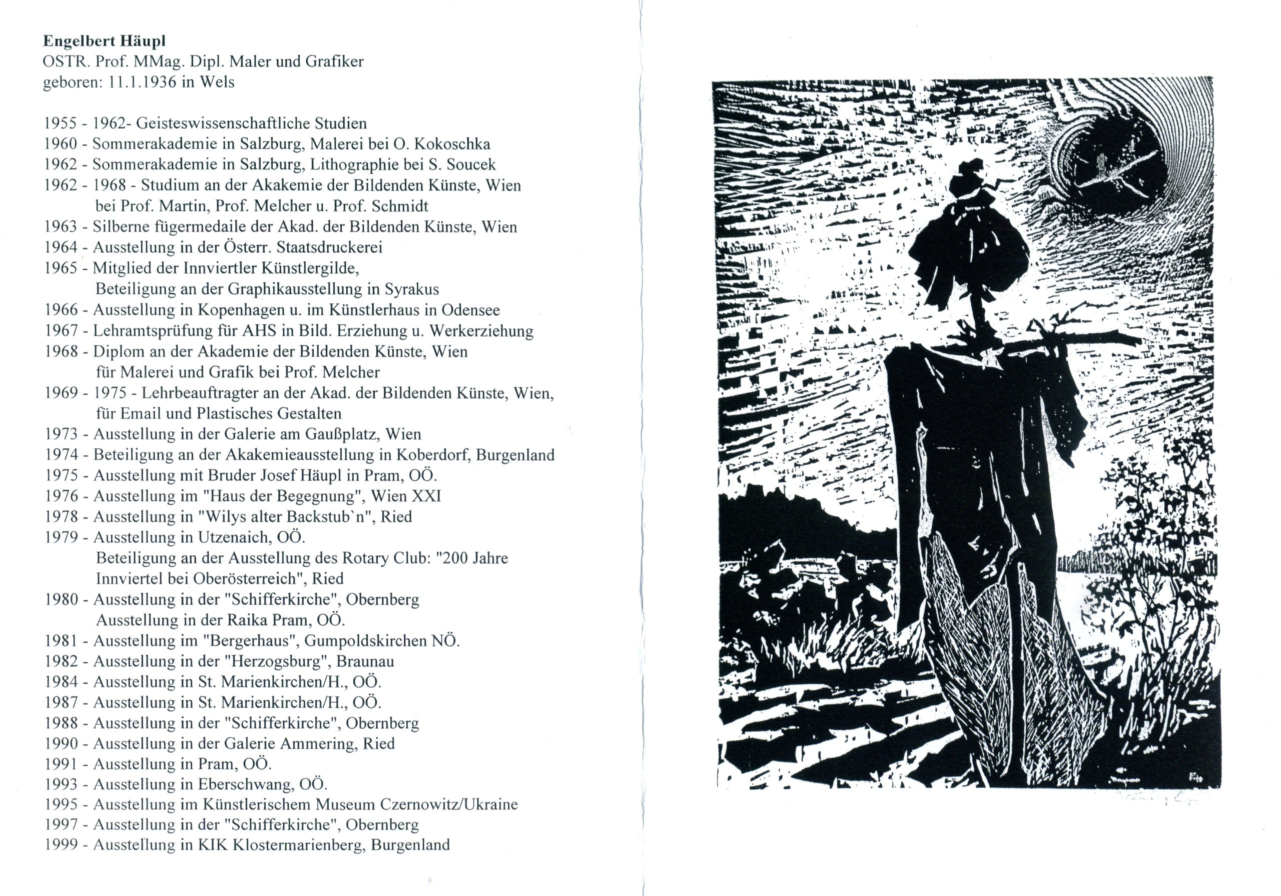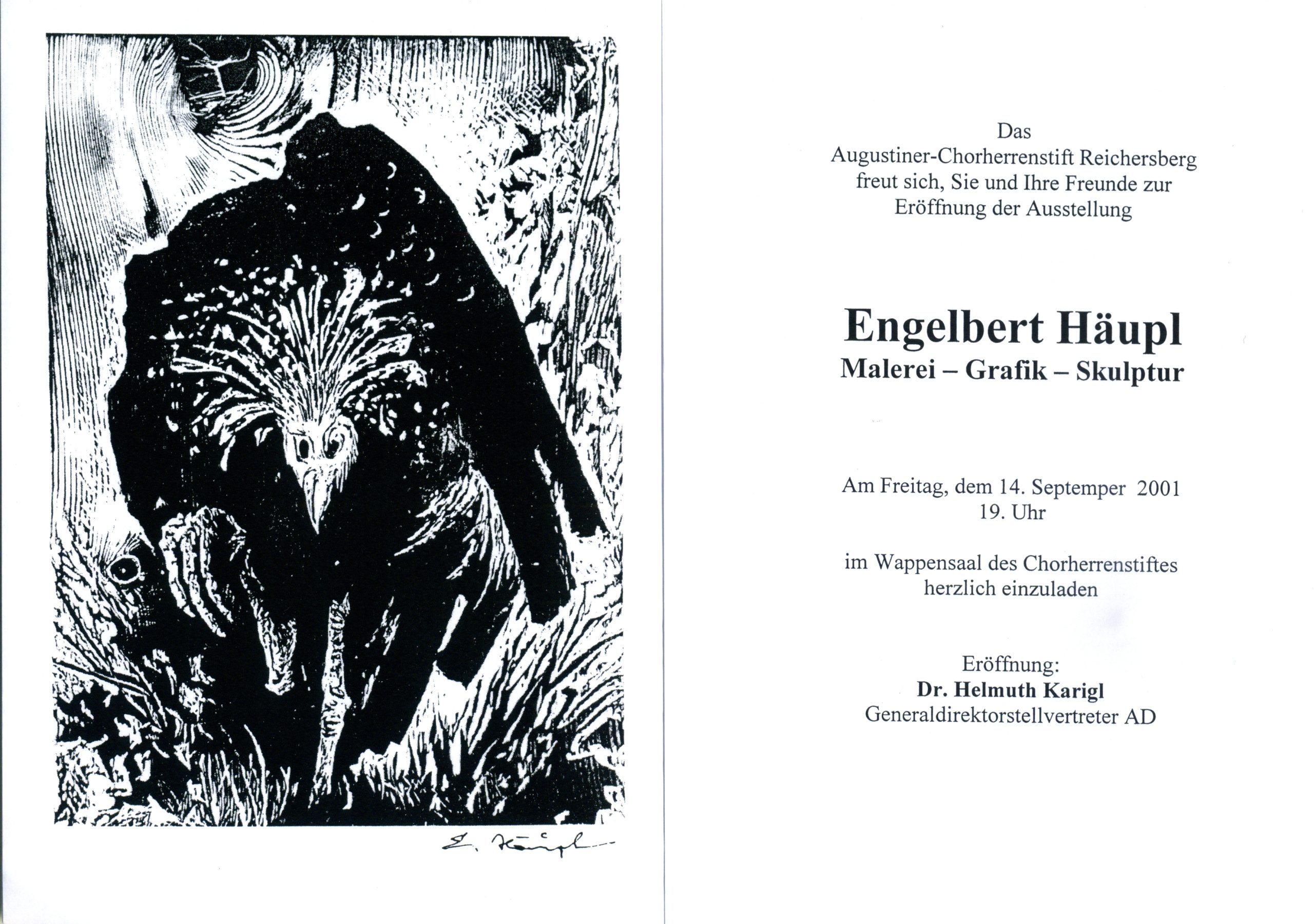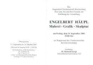 E. Häupl - AusstellungenEngelbert Häupl Ausstellung in der Stiftsgalerie Reichersberg Matthäus HäuplJuli 16, 2025Aug. 5, 2025 14. 09. bis 14. 10. 2001 im Augustiner Chorherren-Stift Reichersberg / OÖ Plakat / Einladung Einladung Eröffnung Einladung Einladung innen Kulturprogramm Fotos Pressemeldungen 11.10.2001 Rieder Rundschau Rieder Magazin Lebenslauf Grafische Arbeiten Plastische Arbeiten Sonstige Arbeiten Arbeiten in der Öffentlichkeit Ausstellungen Aus den Fotoalben Filme & Videos Presse-Archiv Liste Ergänzungen E. Häupl Den Künstlern auf der Spur We use cookies to improve your experience on our website Accept Decline