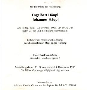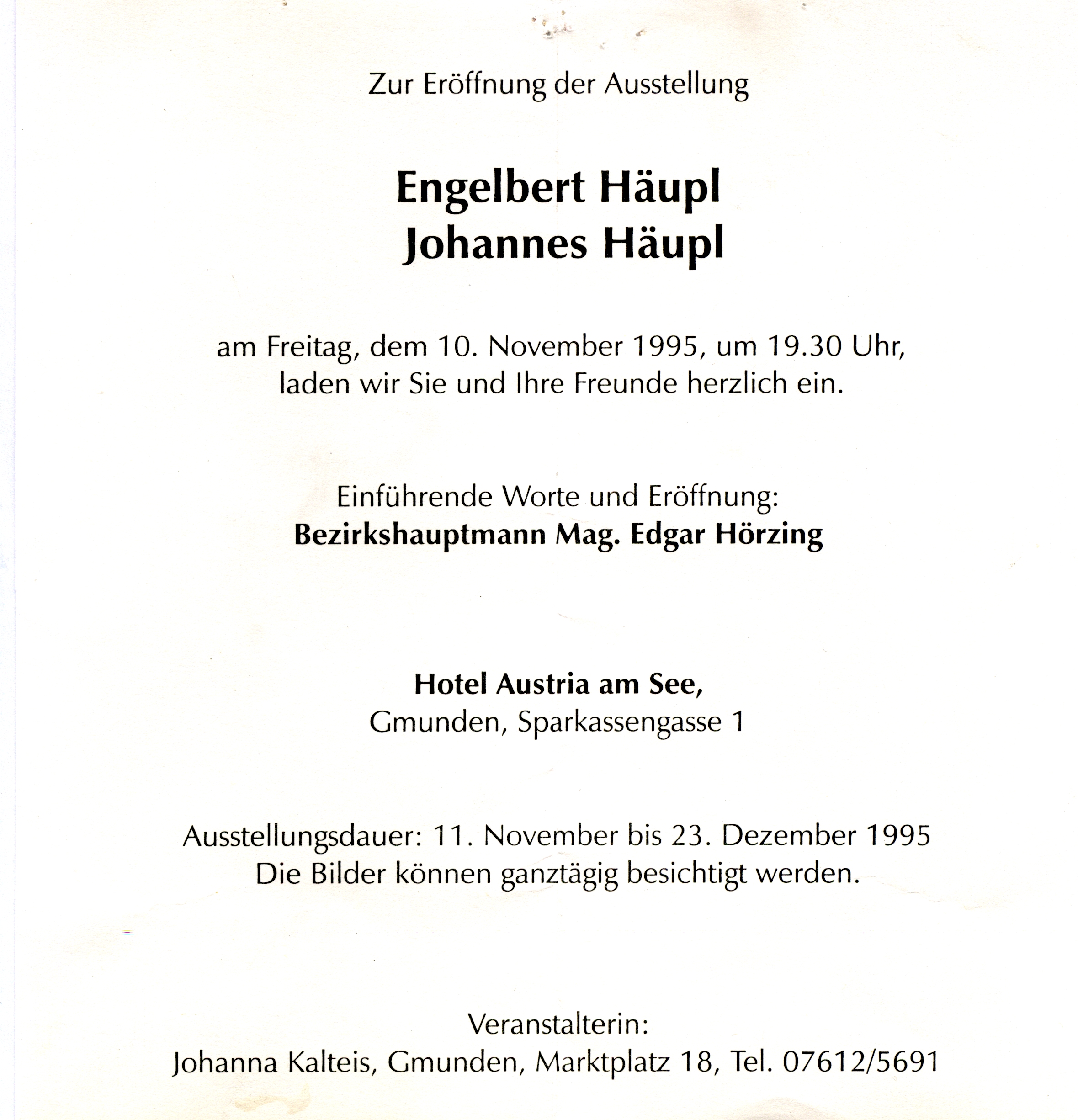 E. Häupl - AusstellungenEngelbert Häupl Ausstellung in Gmunden Matthäus HäuplJuli 16, 2025Aug. 5, 2025 10. 11. bis 23. 12. 1995 im Hotel Austria am See Gmunden / OÖ Plakat / Einladung Pressemeldungen 10.11.1995 OÖ Nachrichten Lebenslauf Grafische Arbeiten Plastische Arbeiten Sonstige Arbeiten Arbeiten in der Öffentlichkeit Ausstellungen Aus den Fotoalben Filme & Videos Presse-Archiv Liste Ergänzungen E. Häupl Den Künstlern auf der Spur We use cookies to improve your experience on our website Accept Decline