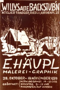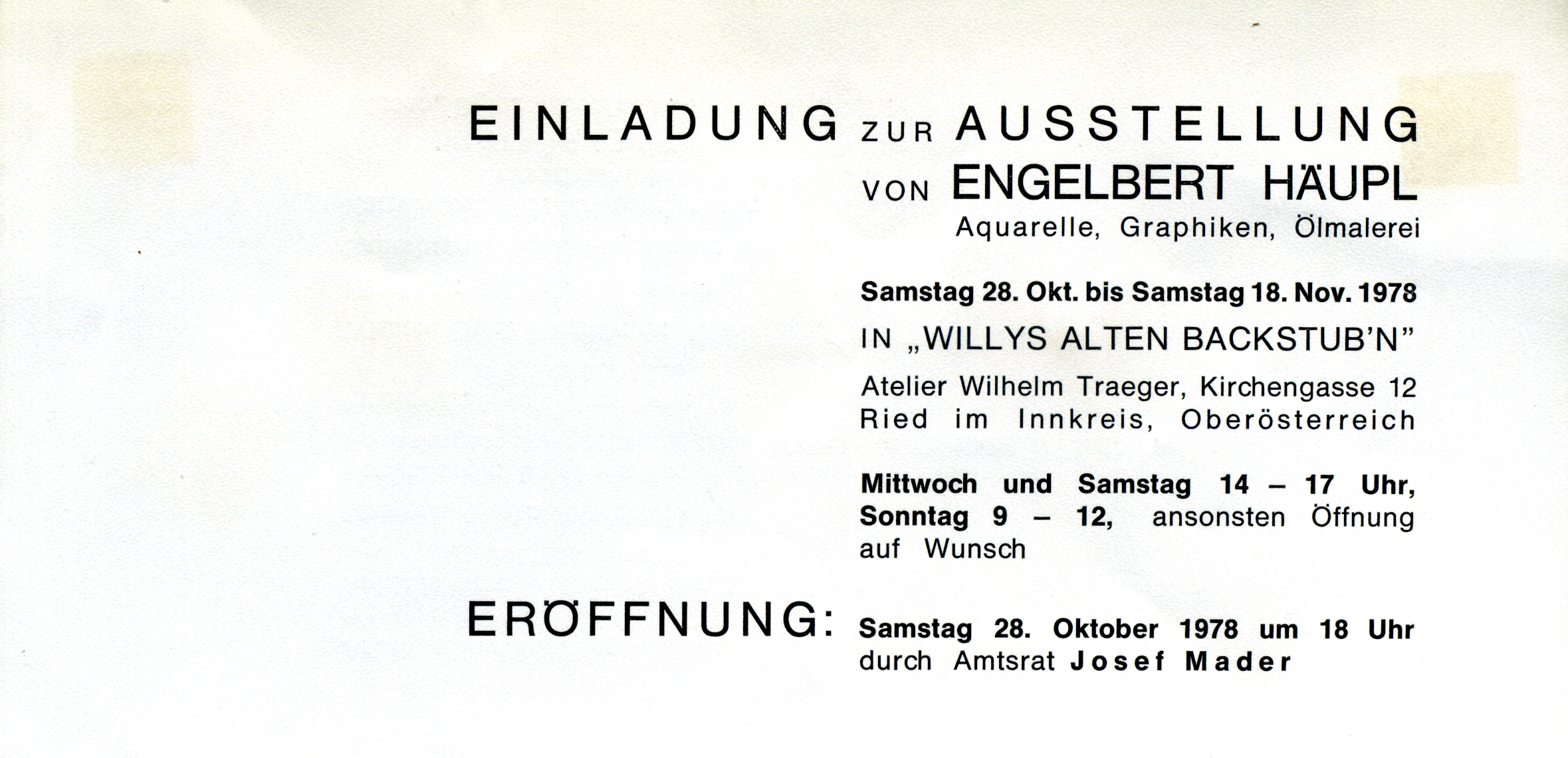 E. Häupl - AusstellungenEngelbert Häupl Ausstellung in „Willys alter Backstub ’n“, Ried i. I. Matthäus HäuplJuli 14, 2025Aug. 5, 2025 08. 10. bis 18. 11. 1978 in „Willys Alter Backstubn“ Ried i.I. / OÖ Plakat / Einladung Plakat Einladung Einladung innen Fotos Pressemeldungen 02.11.1978 Neues Volksblatt 16.11.1978 Rieder VZ Lebenslauf Grafische Arbeiten Plastische Arbeiten Sonstige Arbeiten Arbeiten in der Öffentlichkeit Ausstellungen Aus den Fotoalben Filme & Videos Presse-Archiv Liste Ergänzungen E. Häupl Den Künstlern auf der Spur We use cookies to improve your experience on our website Accept Decline
