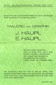 E. Häupl - AusstellungenEngelbert HäuplJ. Häupl – AusstellungenJosef Häupl Ausstellung mit Bruder Josef in Pram Matthäus HäuplJuli 14, 2025Aug. 15, 2025 12. bis 20. 04. 1975 im Kath. Bildungswerk Pram / OÖ Plakat / Einladung Einladung Pressemeldungen 14.04.1975 Volksblatt 17.04.1975 Rieder Zeitung 24.04.1975 Rieder Rundschau Lebenslauf Grafische Arbeiten Plastische Arbeiten Sonstige Arbeiten Arbeiten in der Öffentlichkeit Ausstellungen Aus den Fotoalben Filme & Videos Presse-Archiv Liste Ergänzungen E. Häupl Den Künstlern auf der Spur Biografie Grafische Arbeiten Ausstellungen Fotoarchiv Presse-Archiv Gästebuch Den Künstlern auf der Spur We use cookies to improve your experience on our website Accept Decline