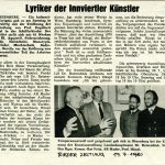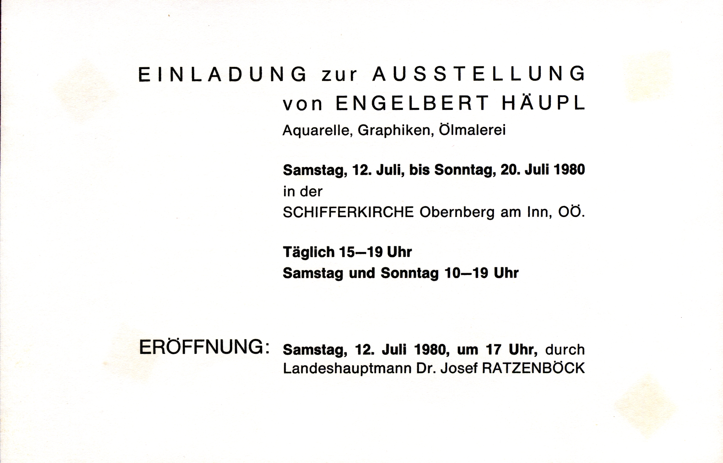 E. Häupl - AusstellungenEngelbert Häupl Ausstellung „Schifferkirche“, Obernberg a. I. Matthäus HäuplJuli 14, 2025Aug. 14, 2025 12. bis 20. 07. 1980 in der Schifferkirche Obernberg / OÖ Plakat / Einladung Einladung Einladung innen Fotos Pressemeldungen 10.07.1980 Rieder Zeitung 11.07.1980 OÖ Nachrichten 17.07.1980 Rieder Zeitung 18.07.1980 OÖ Volksblatt 24.07.1980 Welser Zeitung diverse Schreiben Schreiben Ratzenböck Lebenslauf Grafische Arbeiten Plastische Arbeiten Sonstige Arbeiten Arbeiten in der Öffentlichkeit Ausstellungen Aus den Fotoalben Filme & Videos Presse-Archiv Liste Ergänzungen E. Häupl Den Künstlern auf der Spur We use cookies to improve your experience on our website Accept Decline